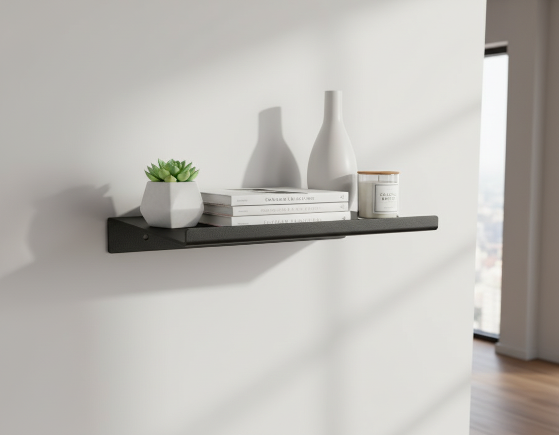 The shelf’s solid steel construction provides reliable support for books, decorative objects, and everyday essentials, while its slim wall-mounted profile maintains a sense of openness and order. The matte black powder-coated finish enhances durability and wear resistance, ensuring long-term performance in residential and commercial settings alike.