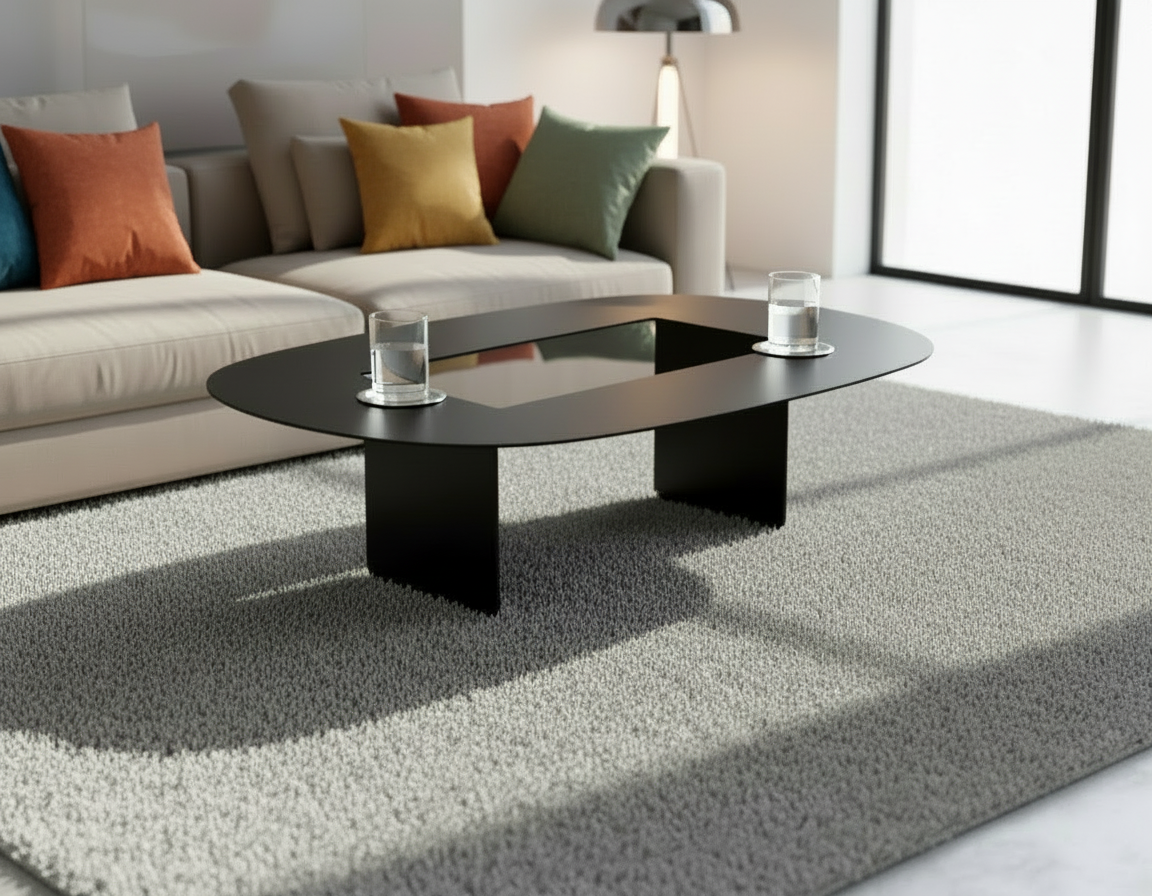 The Napoli coffee table is a contemporary statement piece that merges sculptural design with everyday practicality. Crafted from steel and finished in a durable black powder coating, the table features a precision cut-out section that transforms its bold form into a highly functional storage solution.
